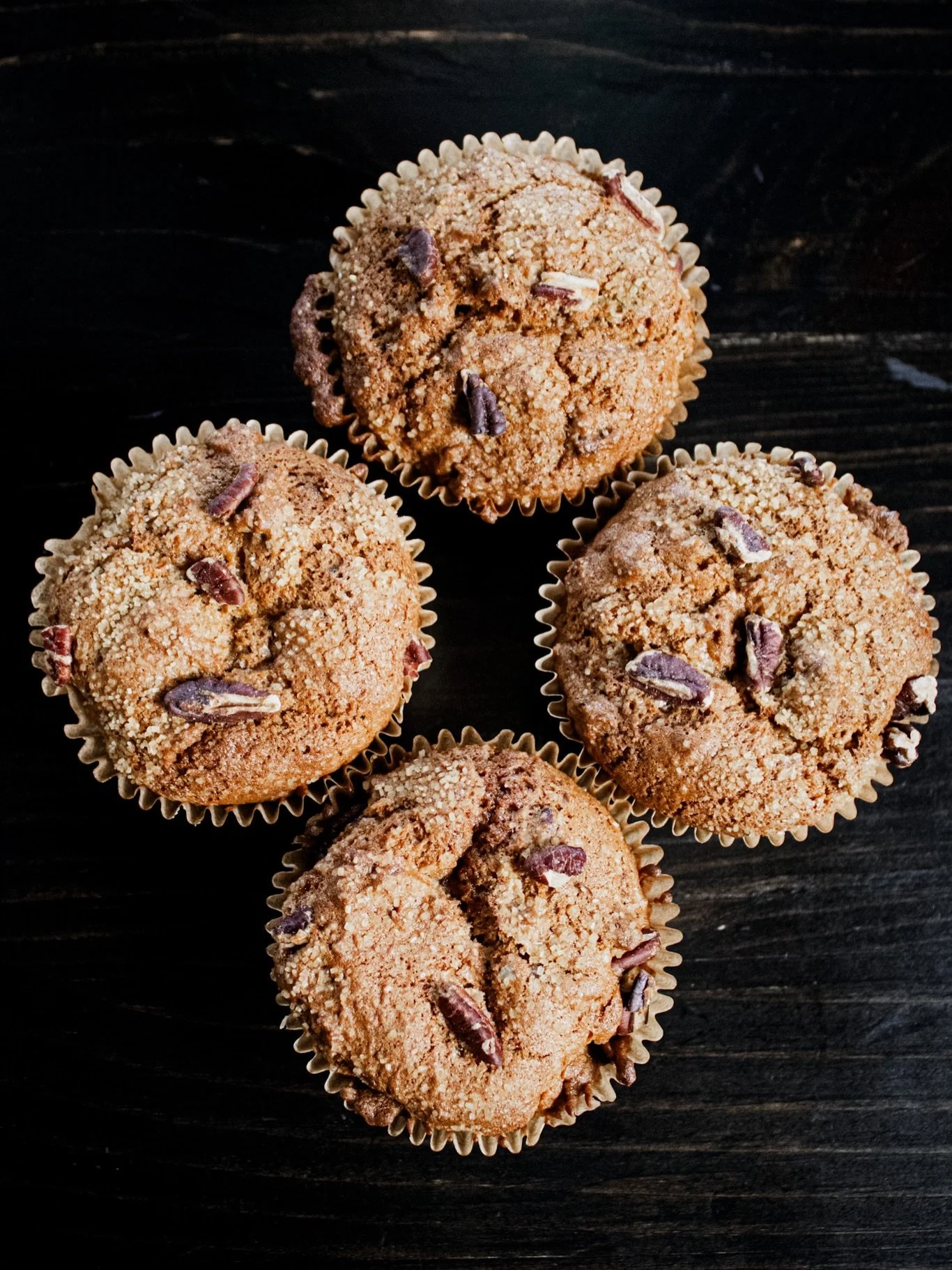 Fluffy muffin warmly spiced with cinnamon and topped with chopped pecans.